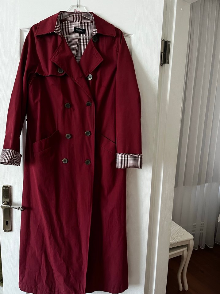 Bordo renkli uzun trençkot, düğmeli ön ve kesimli yakaya sahiptir. Regular kesim, uzun kollu ve yumuşak sentetik kumaştan yapılmıştır. Günlük kullanıma uygundur.