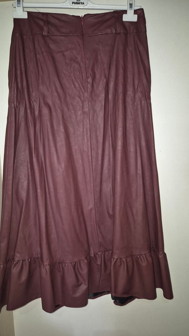 Bordo, sentetik deri uzun etek, gevşek kesim ve etek ucu fırfır detaylarıyla ofis ortamına uygun gotik tarzda.