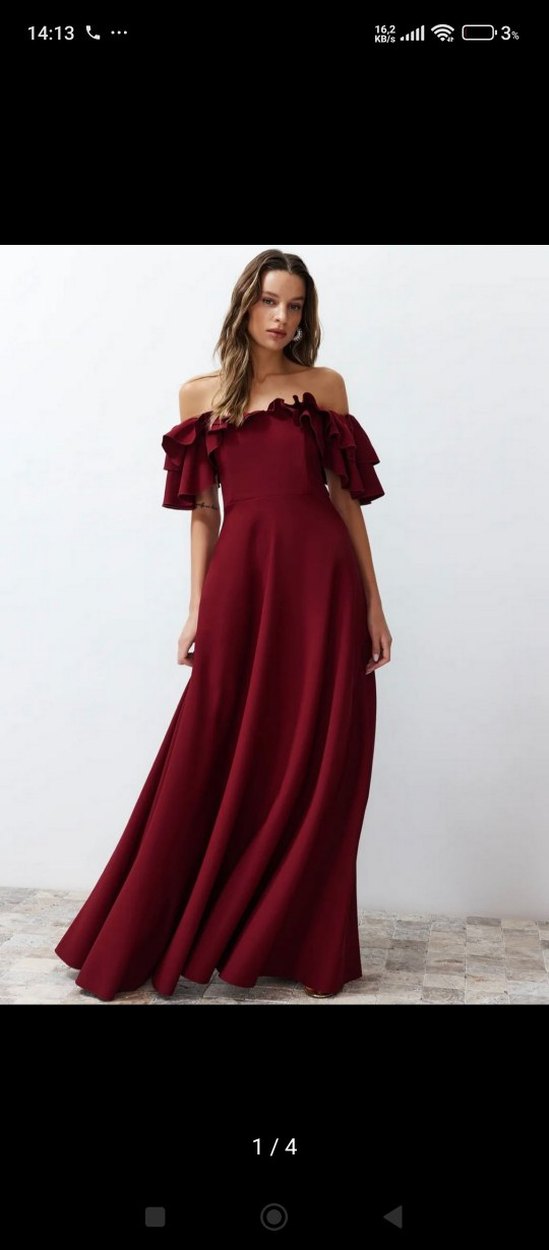 Bordo Uzun Fırfırlı Kayık Yaka Elbise