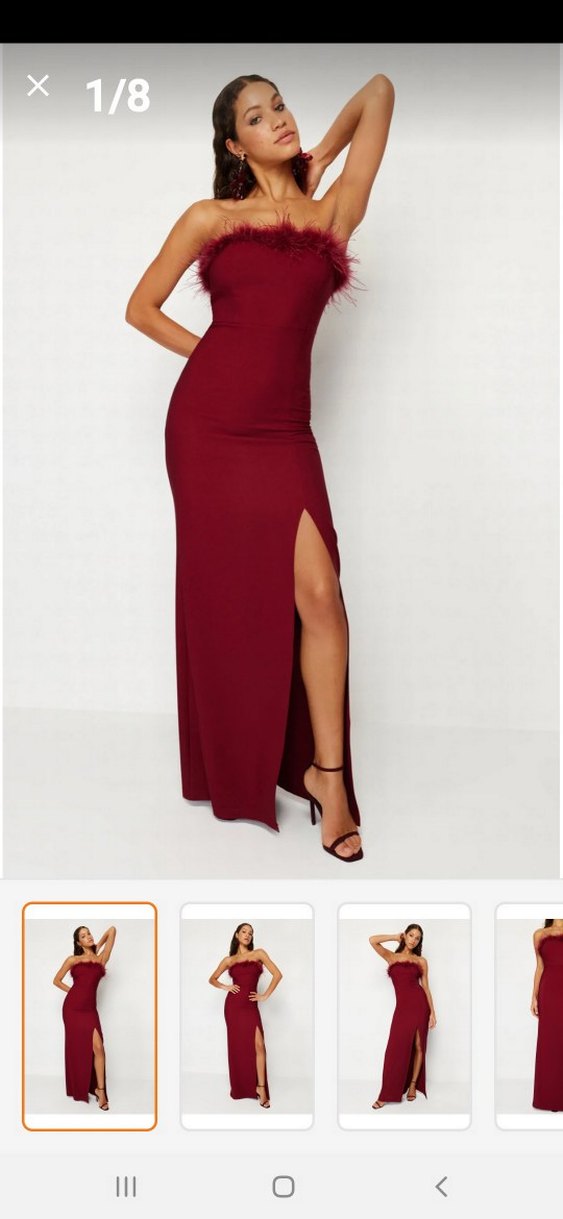 Bordo, vücuda oturan uzun elbise, tüylü straplez yaka ve bacak dekoltesiyle dikkat çekiyor. Romantik akşamlar için ideal. ✨