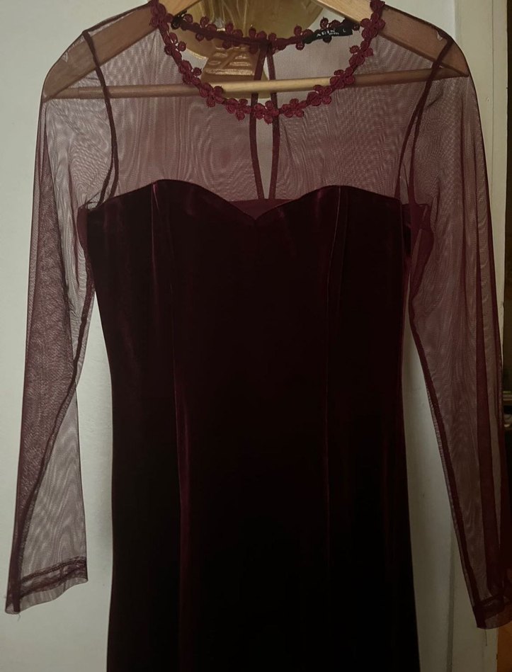 Bordo renkte, V yaka ve ince askılı, drapeli uzun abiye elbise. Gotik tarzda, klasik şıklık sunan tül uzun kollara sahiptir. Romantik akşamlar için uygun.