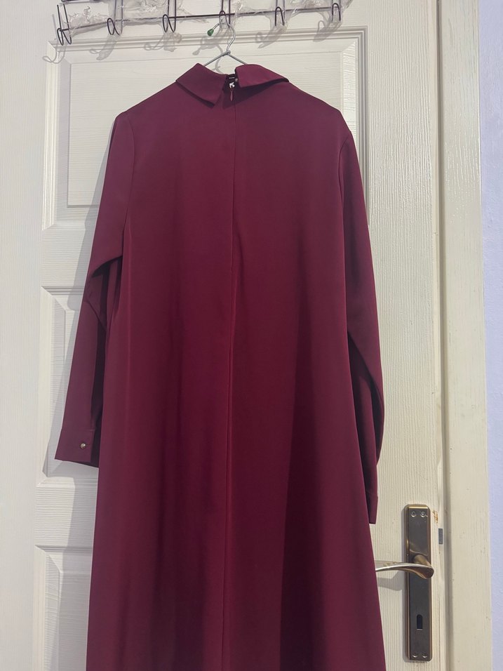 Bordo renkli, ipeksi kumaştan yapılmış, yüksek yakalı, bol kesim ve uzun kollu hamile kabanı. Ofis kullanımı için uygundur.
