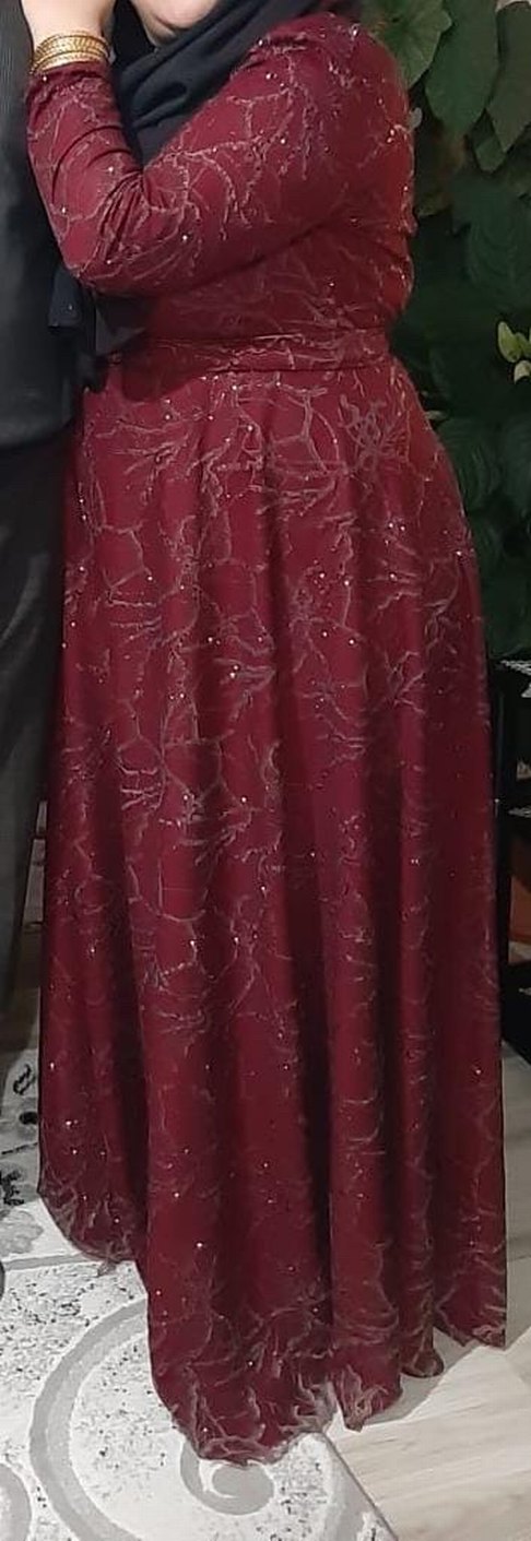 Bordo renkli, işlemeli, dökümlü ve bol kesim kadın abiye. Kolsuz ve V yakalı tasarımıyla düğünler için uygundur, ışıltılı ve bohem tarzda. ✨ bir kere giyildi temİ