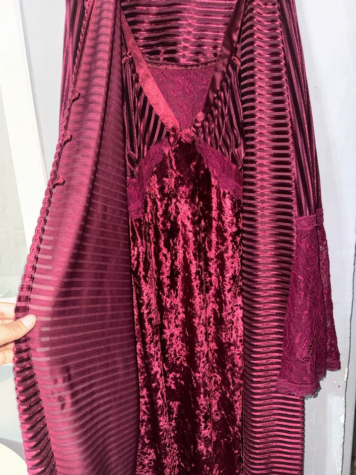Bordo renkte, uzun ve bol kesim bohem tarzı kadın gecelik takımıdır. İnce askılı, desenli kadife gecelik ve dantel detaylı çizgili sabahlık içerir.2 parça
