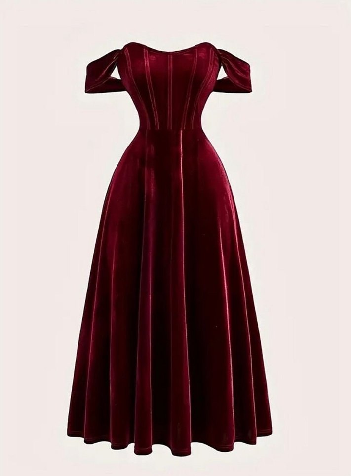 Bordo renkli, uzun boy, dar kesim kadın abiye elbise. Kayık yaka ve drapeli askılı kollara sahip, vintage goth tarzında, desensiz ve koyu renklidir.