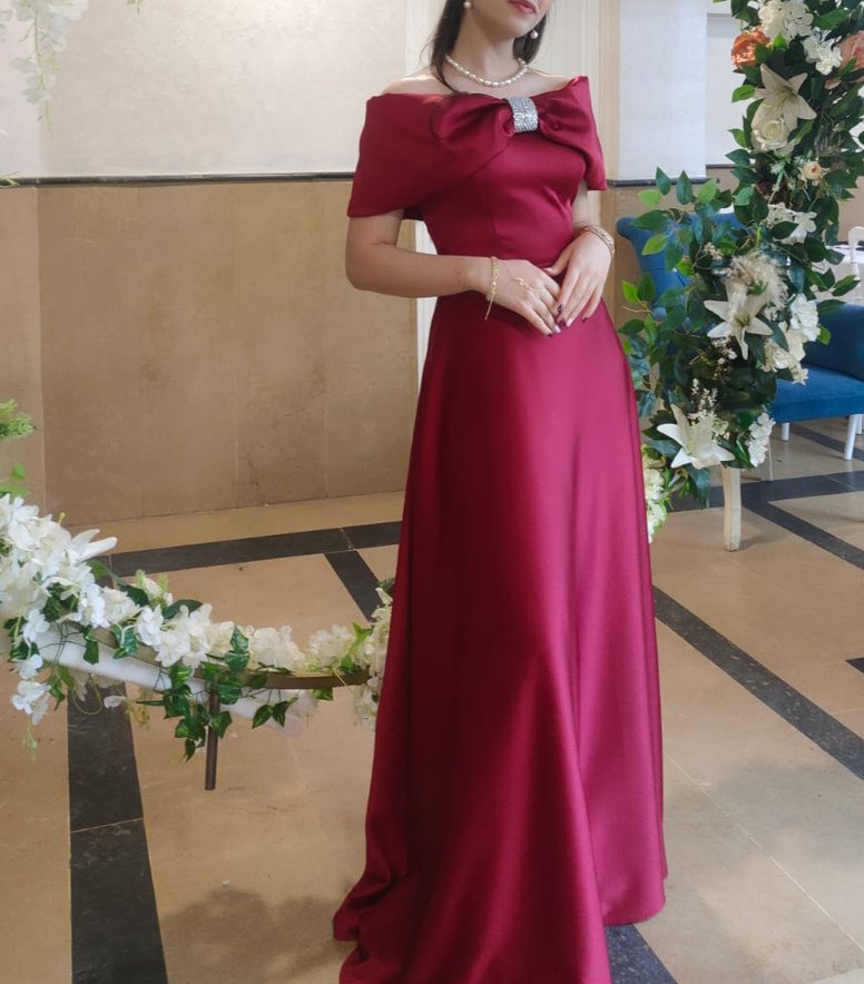 Bordo uzun abiye elbise, kayık yaka ve kısa kollu, drapeli modern klasik kesime sahip, düğün ve şık davetler için uygundur. ✨