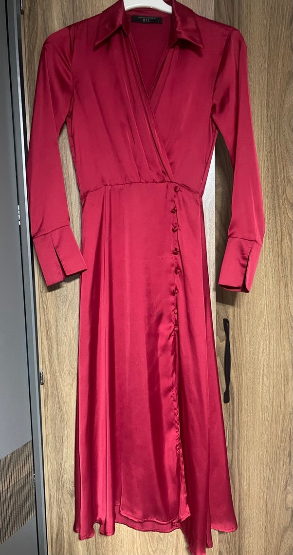 Bordo renkli, saten kumaş uzun elbise. Notlu yakalı, uzun kollu, düğmeli ve rahat kesimli. Romantik akşamlar için ideal. Üzerinde daraltma işlemi yapılmıştır.