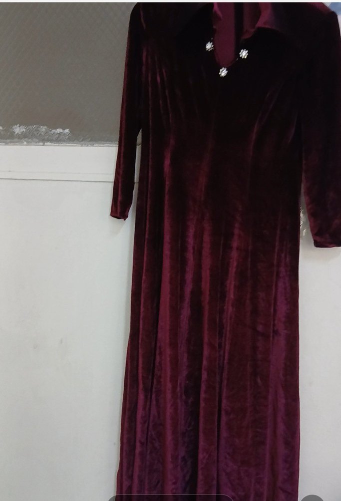 Bordo uzun elbise, V yaka ve uzun kollu, ince oturan kesimle. İpeksi kumaştan drapeli tasarım, gotik tarz ve romantik akşamlar için uygun.