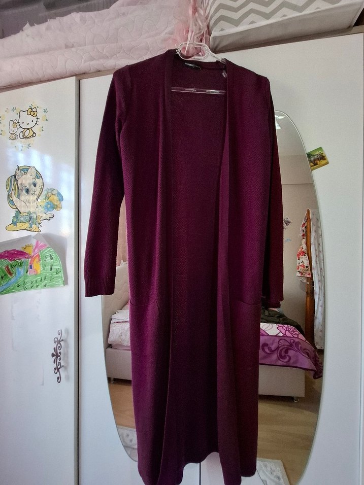 Uzun, bordo renkli kadın hırka, bol kesim ve kesik yaka ile uzun kolludur. İpeksi dokuda, drapeli tasarıma sahip, desen içermeyen koyu renktedir, günlük kullanıma uygundur. kullanmaya bağlı hafif tuylenmeler mevcut resimde belirttim
