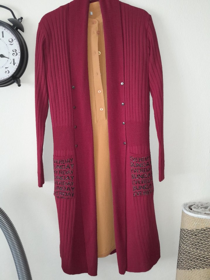 Bordo uzun kadın hırka,yakasında kesikli rever ve ceplerinde desenli detaylar bulunur. Rahat ve günlük kullanıma uygundur.