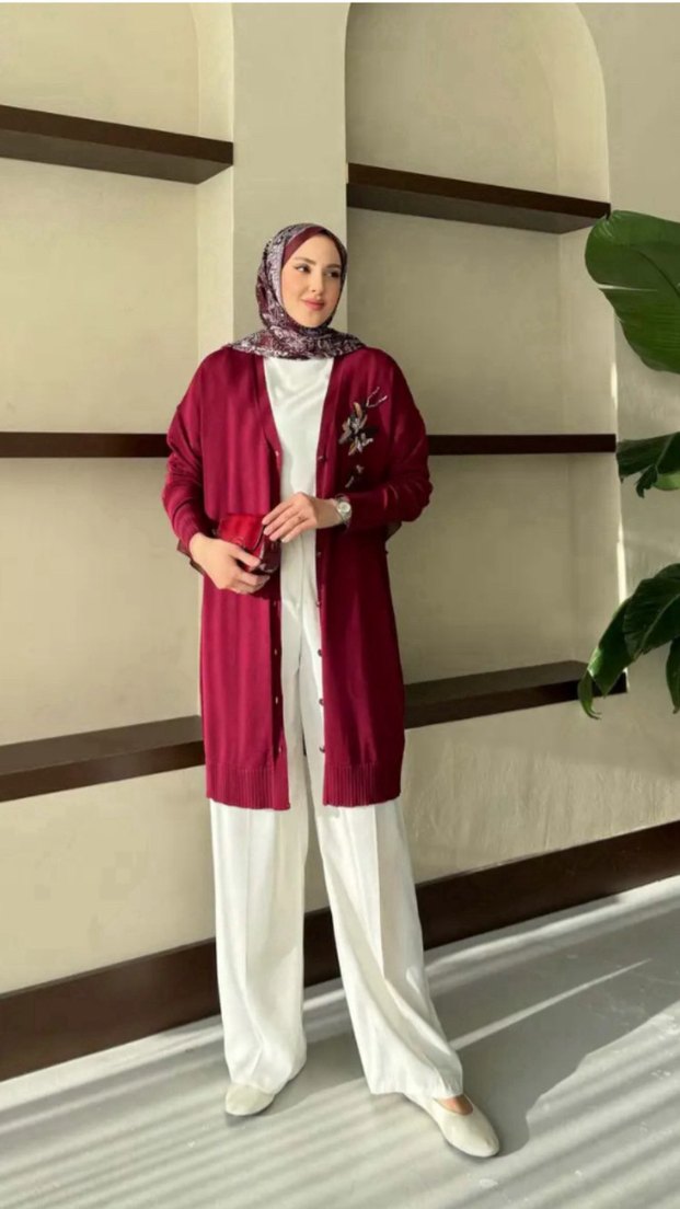 Bordo uzun kadın hırka, hafif batik desenli ve ipeksi kumaştan yapılmıştır. Klasik yakalı ve uzun kollu, rahat kesimlidir.