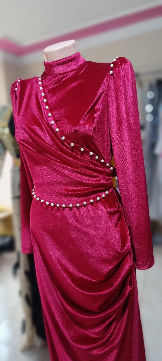 Bordo renkli, uzun ve vücuda oturan bu abiye elbise, drapeli detaylar ve inci süslemelerle yüksek yakada şıklık sunar. Parlak kumaşıyla düğünler için uygundur.✨