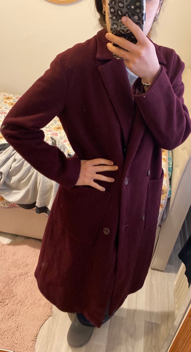 Derin bordo renkte, çift düğmeli ve büyük cepli uzun kadın kabanı. İç kısmı yumuşak astarlıdır.