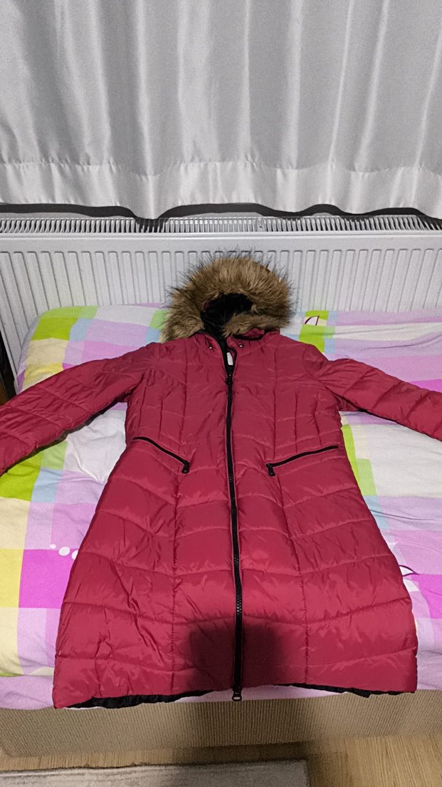 Bordo renkli, uzun ve vücuda oturan kadın kabanı, yaka kısmında kesim ve kürk detaylı kapüşon içerir. Yumuşak ve sıcak kumaştan, uzun kolludur ve dış mekan kullanımı için fermuarlı ceplidir.