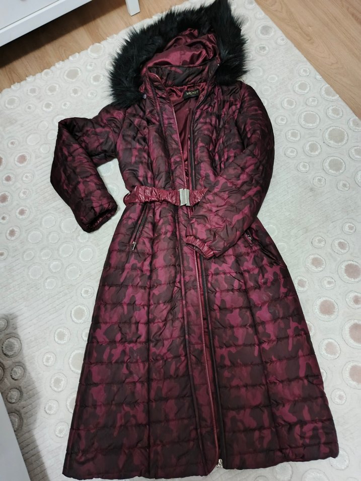 Bordo bağlama desenli, uzun ve fitted kesim kadın kışlık mont. Kürklü kapüşon ve kemer detaylı, sentetik kumaştan üretilmiş rahat bir model. Strappy kollu, notched lapel yakalı, sokak modasına uygun. ❄️