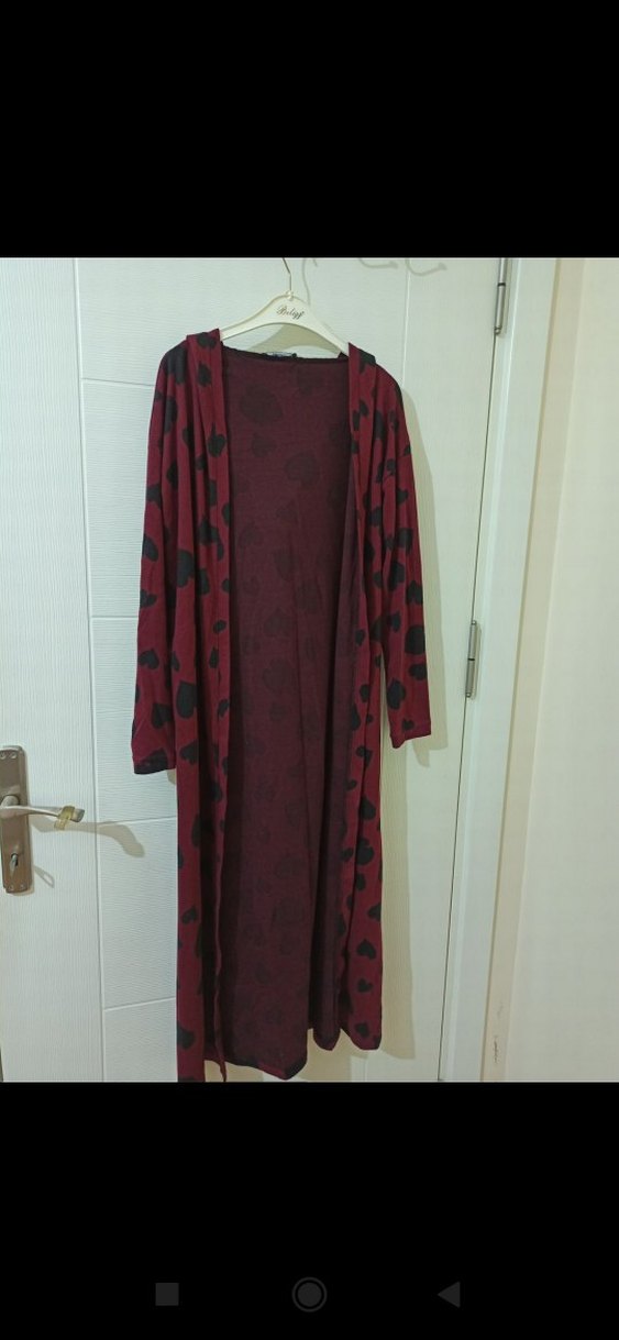 Bordo renkli, uzun kollu ve bol kesim kadın sabahlık, koyu tonlarda batik desenlidir ve rahat bir tarz sunar.