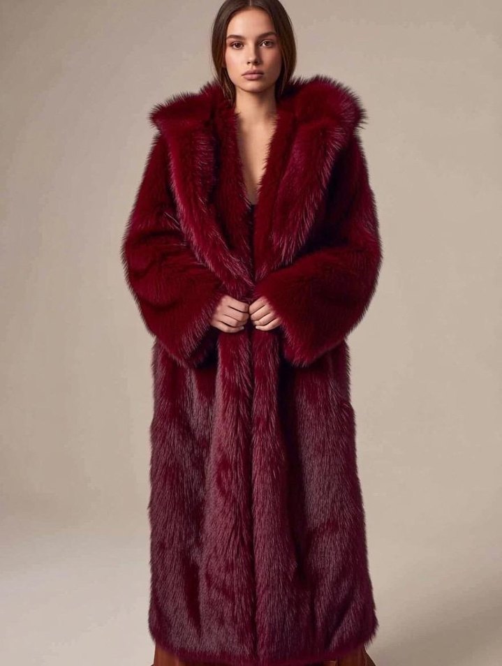 Bordo renkli, uzun ve bol kesim suni kürk kaban, yakasında kesik yakalı detay bulunur. Düz deseni ve uzun kollarıyla rahat, bohem tarzda günlük kullanıma uygundur. Yapay zeka fotoğraftaki