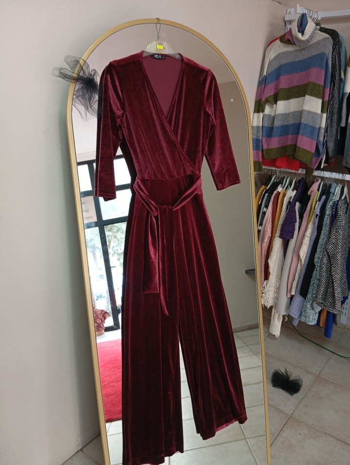Bordo uzun kadın tulum, drapeli tasarımı ve V yakasıyla şık bir görünüm sunar. Uzun kollu ve regular fit kesimi romantik akşamlar için uygundur. Paris sokak modası tarzında klasik bir parça. ❤️