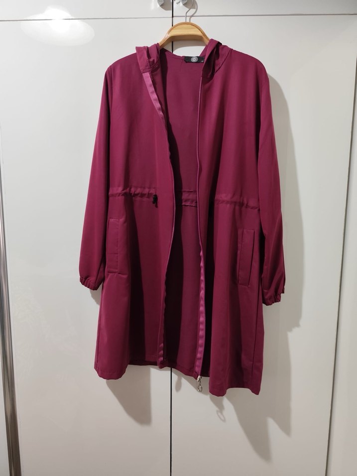 Bordo uzun yağmurluk, bol kesim ve çentikli yakaya sahiptir. Uzun kollu, fermuarlı ve sentetik kumaştan yapılmıştır, günlük kullanıma uygundur. ️