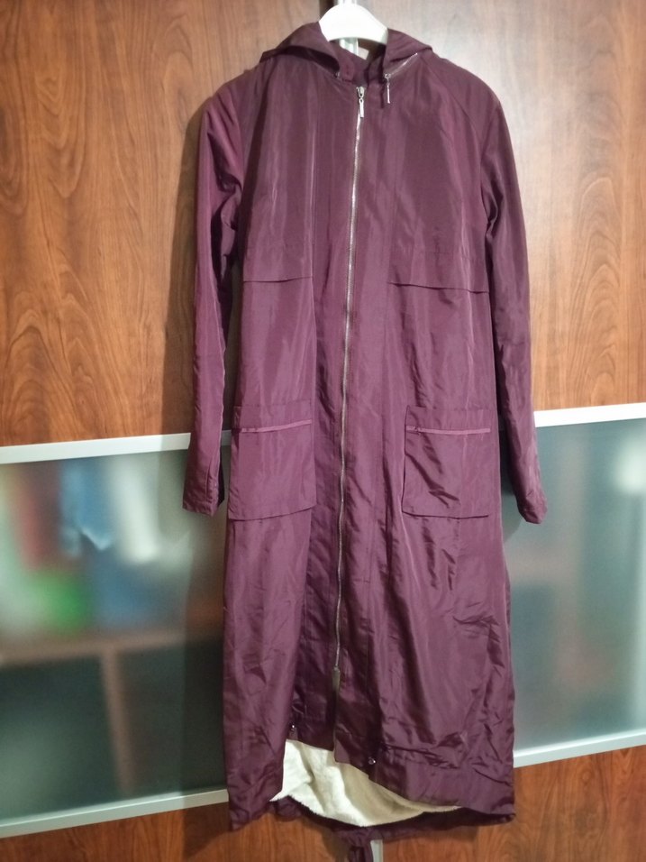 Bordo renkli, fermuarlı uzun kadın yağmurluğu. Sentetik kumaştan, regular fit ve uzun kollu. Minimalist tarzda günlük sokak giyimine uygun.