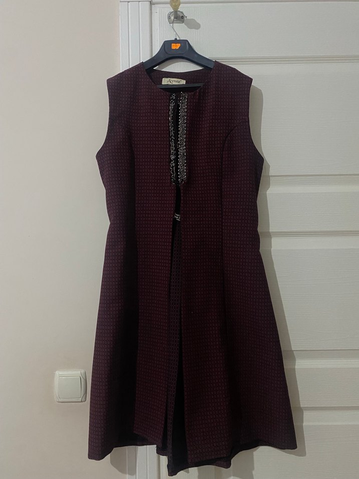Bordo renkli, uzun kesim kadın yelektir. Düğmeli, yakası kesik ve kolsuzdur. Sentetik kumaştan yapılmış, günlük kullanıma uygundur.