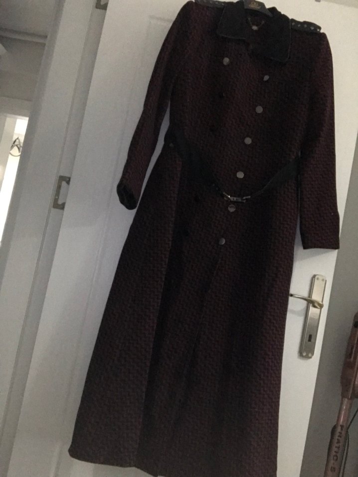 Bordo uzun yün kaban, kesik yakalı ve düğmeli tasarıma sahiptir. Regular fit ve uzun kolludur, vintage goth tarzında günlük kullanıma uygundur.
