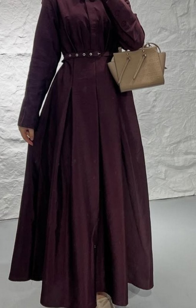 Bordo uzun elbise, kemerli ve yakalıdır. İpek gibi kumaştan, bol kesim ve askılı kolludur. Günlük kullanıma uygundur. sadece iki saat kullandım şal hediyemdir görselde kırışık duruyor ütüsüz olduğu için şal da iki saat kullanıldı iki renklidir