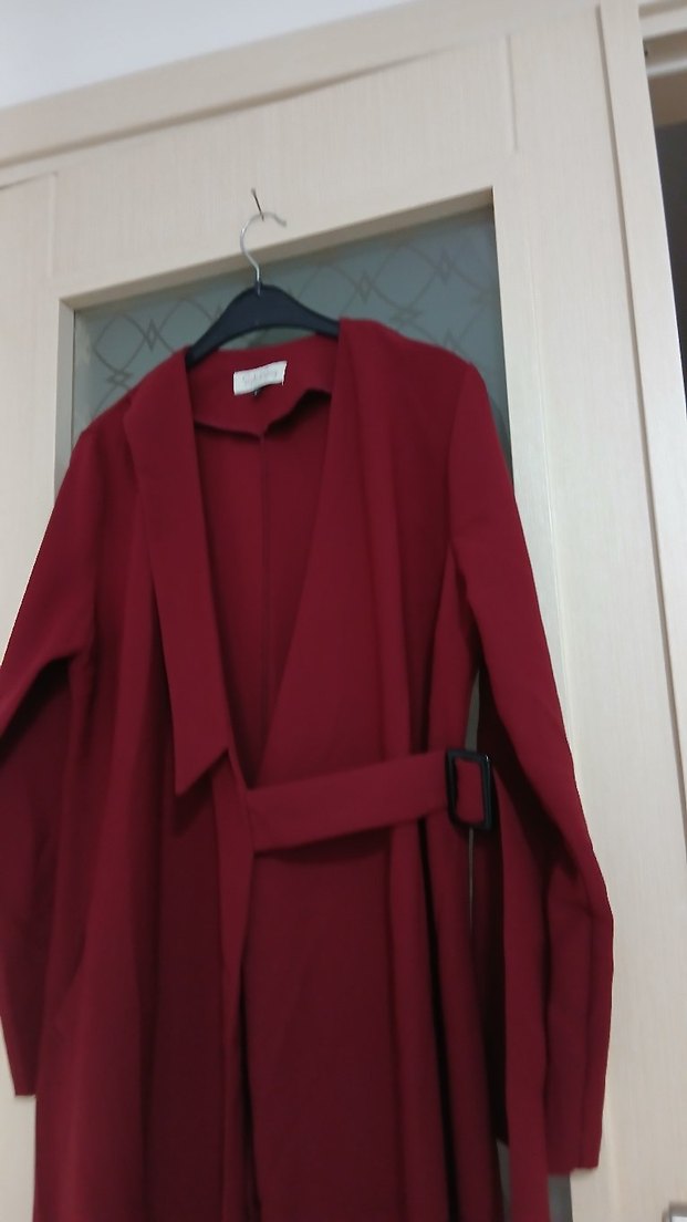 Bordo uzun boy, kemerli kadın kaban. Notch yaka ve uzun kolludur. Sentetik kumaştan, düz desensiz ve günlük kullanıma uygundur. temiz yeni gibidir. boy 118 iki göğüs arası 46