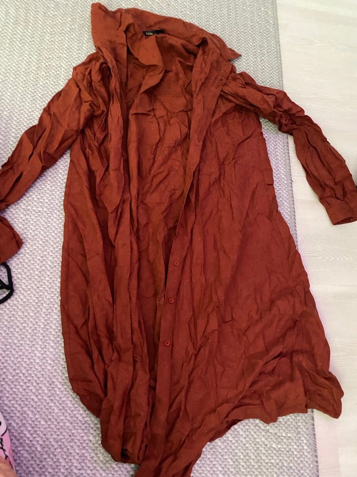 Bordo renkli uzun keten hamile ceketi, dökümlü ve bol kesimdir. Uzun kollu ve yakalıdır, günlük kullanım için bohem tarzı sunar.