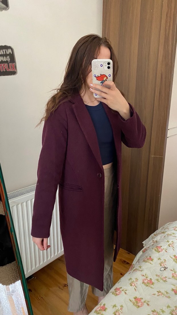 Bordo renkli uzun kaban, klasik kesim ve yaka detayıyla şık bir görünüm sunar. İki cep detayı bulunmaktadır.