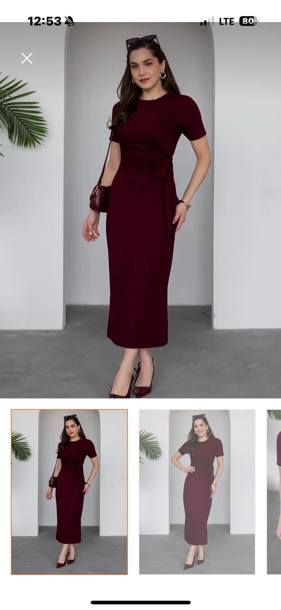 Bordo renkte, yüksek yakalı ve askılı kollu uzun elbise. Kemer detaylı, sentetik kumaştan, ofis için uygun minimalist ve şık tasarım.