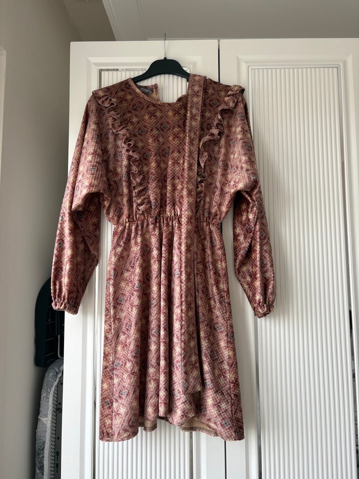 Bordo renkli, yüksek yakalı ve uzun kollu bu uzun elbise, salaş kesimi ve sentetik kumaşı ile dikkat çeker. Drapeli tasarıma ve batik desenlere sahiptir.