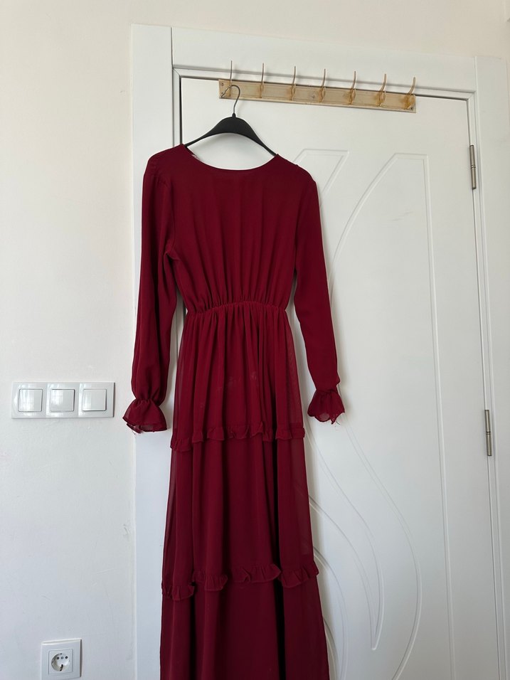 Bordo renk uzun, bol kesim elbise, uzun kollu ve volan detaylıdır. Yumuşak sentetik kumaştan üretilmiş, sade ve bohem tarzda, günlük kullanıma uygundur.