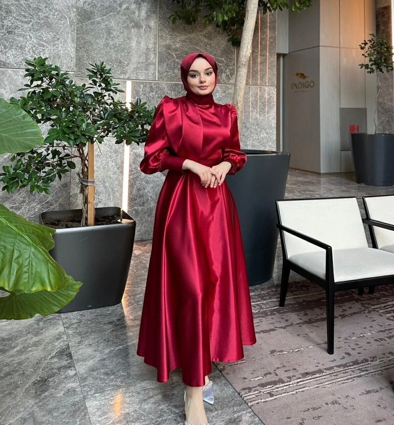 Bordo renkli, uzun kol ve yüksek yakalı, drapeli tasarıma sahip abiye elbise. Parlak kumaş ve etnik desenlerle düğün için uygun.