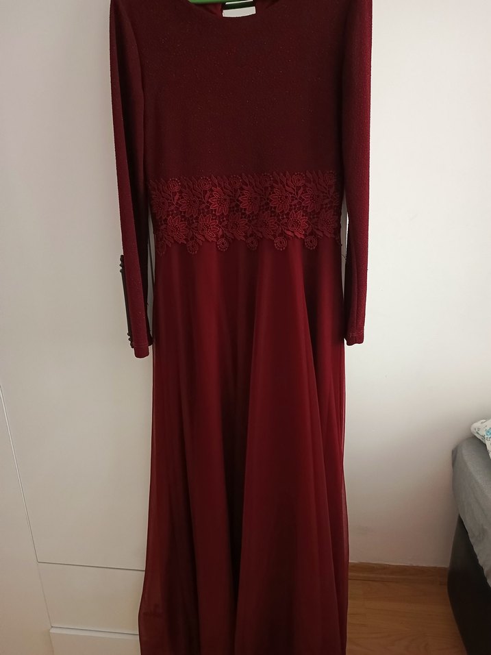 Bordo Uzun Kol Drapeli Abiye Elbise