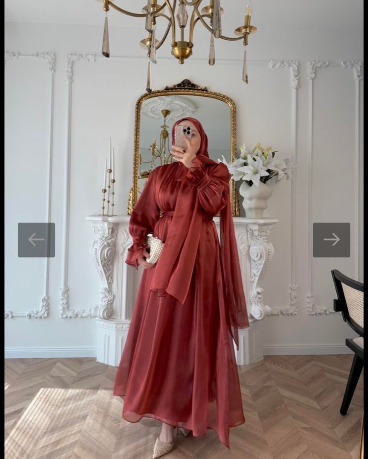 Bordo renkli, uzun kollu, yüksek yakalı, bol ve drapeli kesime sahip bu uzun elbise, gösterişli düğünler için uygundur. Parlak kumaş şıklık katıyor.