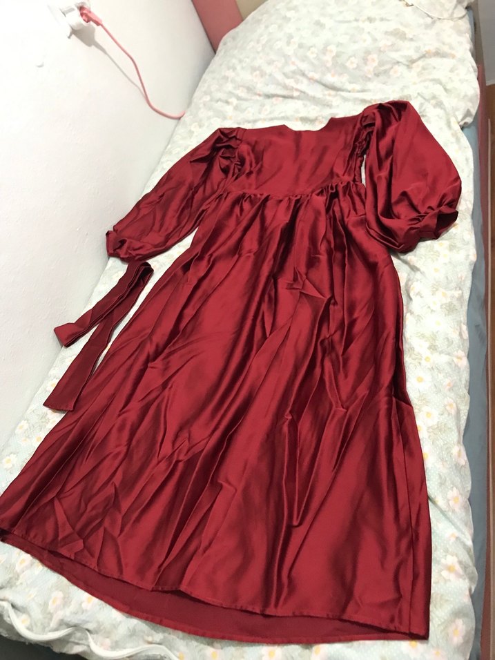 Bordo, parlak ve ipeksi kumaştan uzun, bol kesim, drapeli kadın elbisesi. Uzun kollu ve straplez yakalı, bohem tarzda düğün için uygun.