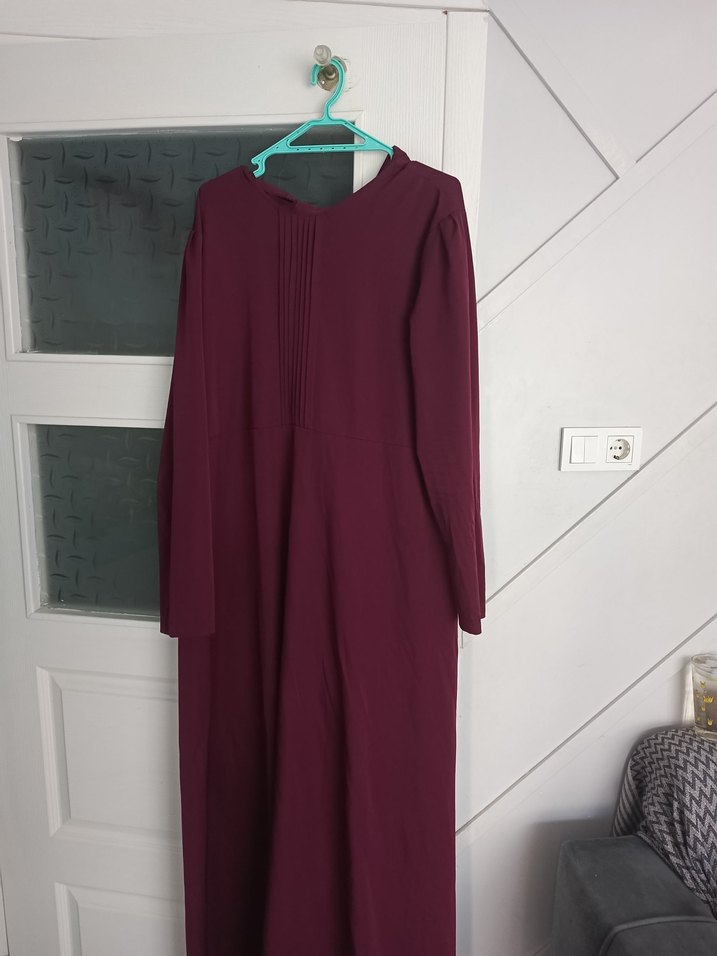Bordo renk, yüksek yakalı, uzun kollu ve drapeli tasarımlı, bol kesim kadın uzun elbise. Yumuşak sentetik kumaştan üretilmiştir.