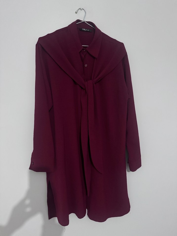 Bordo renkte, uzun kollu ve yakalı, dökümlü detaylı, salaş kesim kadın tunik. Satenimsi kumaştan, ofis için uygun sade ve minimalist tarzda.