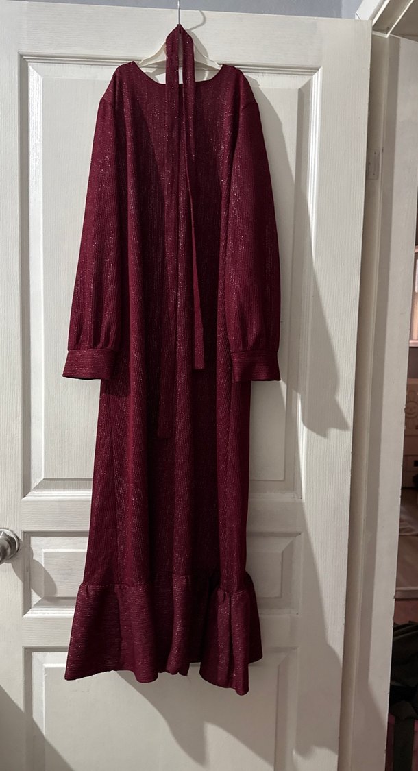 Bordo renkte, yüksek yakalı ve uzun kollu, drapeli tasarıma sahip keten kumaştan rahat ve dökümlü uzun elbise.