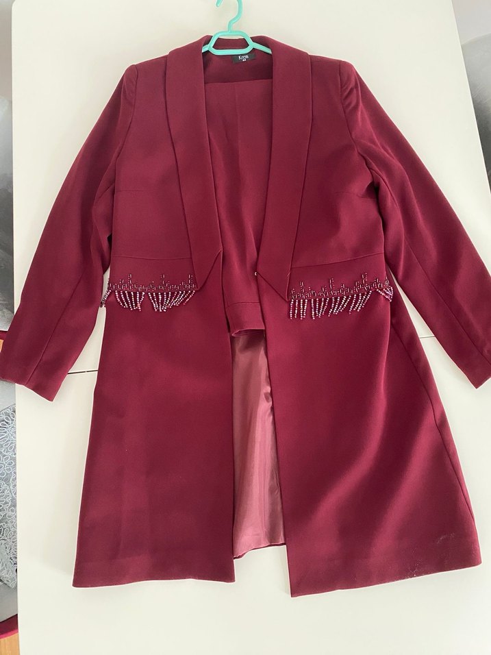 Bordo renkli, düğmeli, uzun kollu kadın takım . Notlu yaka ve parlak dokusuyla ofis stiline uygundur.✨
