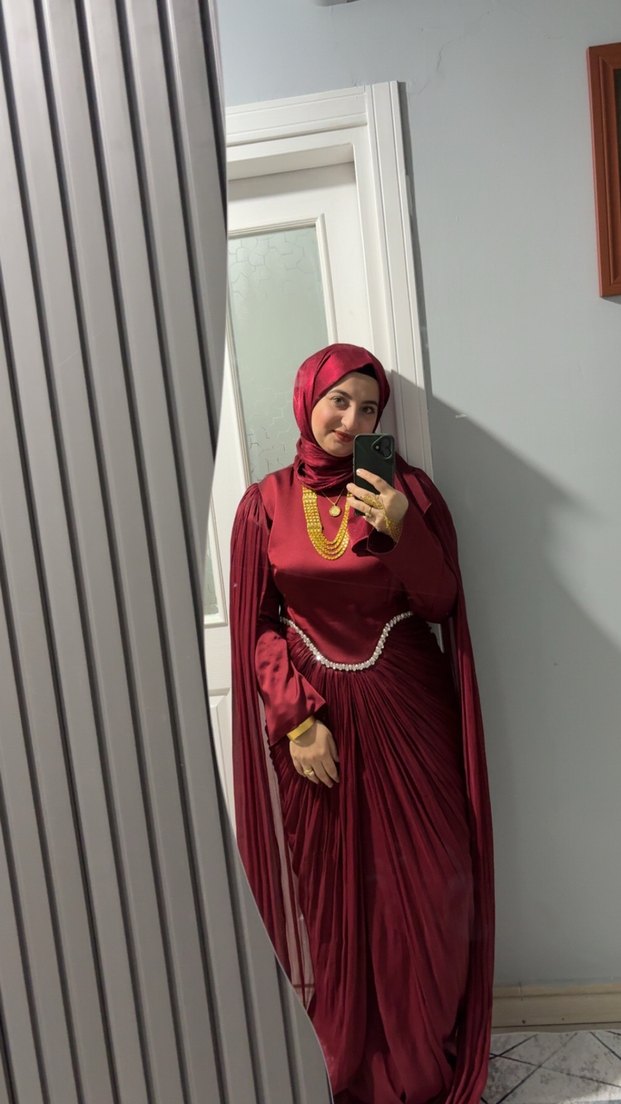 Bordo renkli, uzun kollu, yüksek yakalı ve etnik desenli drapeli elbise. Düzenli kesimi ve modest tarzı ile düğünlere uygundur.