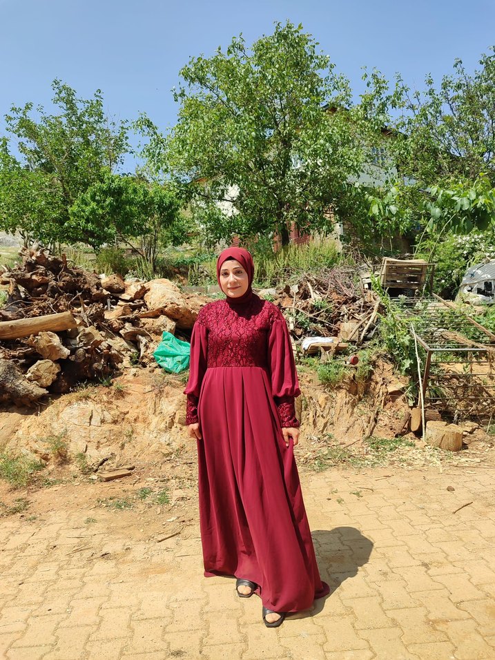 Bordo renkli, yüksek yakalı ve uzun kollu, etnik desenli, drapeli ve bol kesim tesettür elbise. Düğünler için uygun.