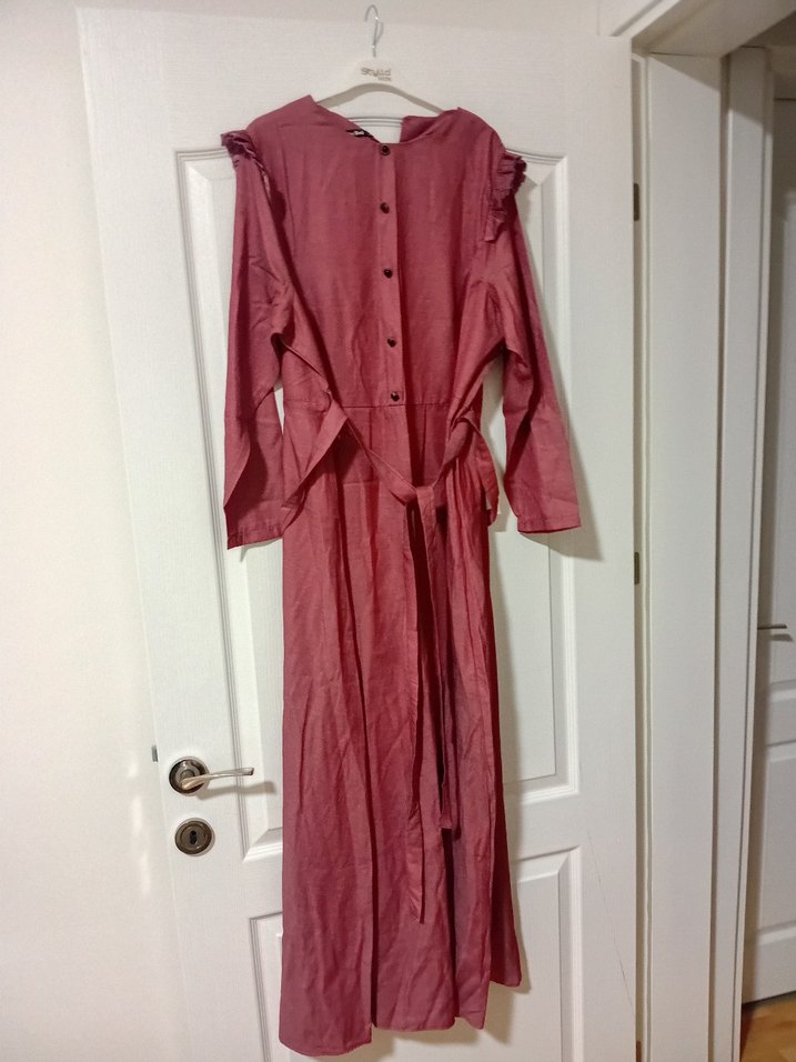 Bordo renk uzun kol fırfırlı keten elbise, bol kesim ve düğmeli ön detaylara sahip, günlük kullanıma uygun rahat bir modeldir. 52 beden