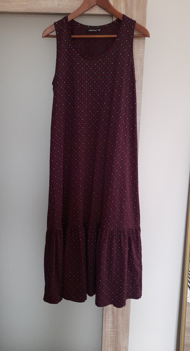 Bordo renkte, uzun boy, kolsuz, fırfır detaylı örme elbise. Rahat kesimli, yuvarlak yakalı ve yumuşak sentetik kumaştan üretilmiştir. Bohem ve retro tarzda, günlük kullanım için uygundur. m L xl uyumludur