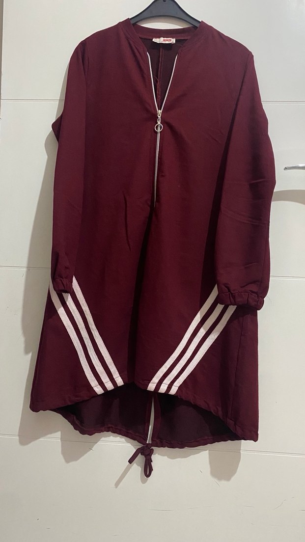 Bordo renkli, yüksek yakalı, uzun kollu ve bol kesim Önden fermuarlı, kollarında beyaz çizgiler bulunan sentetik kumaştan günlük kullanıma uygun.