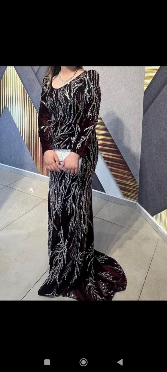 Bordo renkli, uzun kollu, tekne yaka ve bağlama desenli abiye elbise, şık drapeli detaylara sahip, düğünler için uygun.