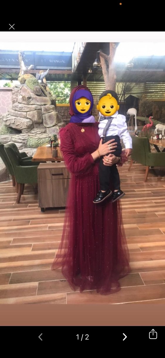 Bordo renginde, uzun kollu ve yüksek yakalı, dökümlü ve batik desenli hamile abiye elbise. Yumuşak sentetik kumaştan, sade ve bohem tarzda, düğünlere uygun