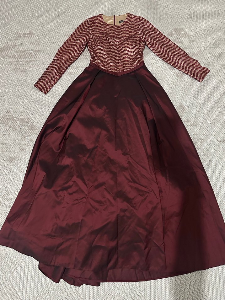 Bordo renkte, işlemeli üst kısmı ve uzun eteği olan, uzun kollu ve klasik modern tarzda abiye elbise. Düğünler için uygundur.