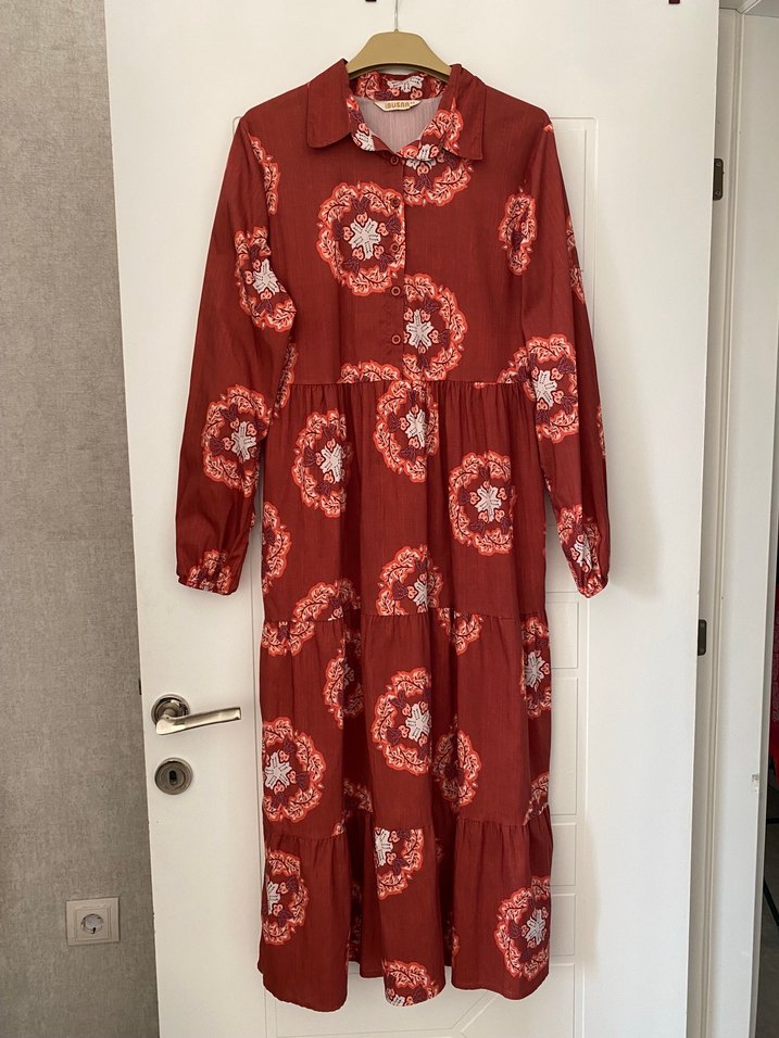 Bordo renkli, düğmeli önü ve yakalı uzun kollu, bol kesim bohem tarzda bağlama desenli uzun elbise. Yumuşak kumaştan, günlük kullanıma uygun.